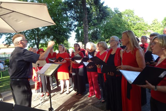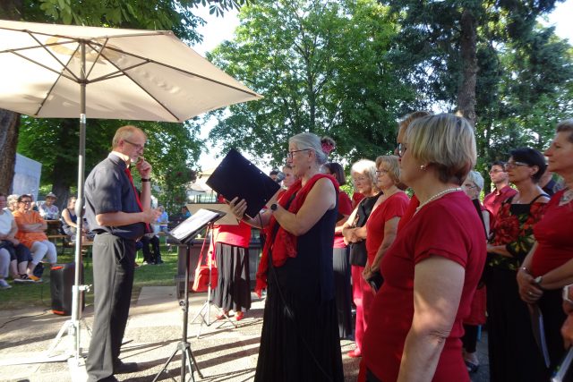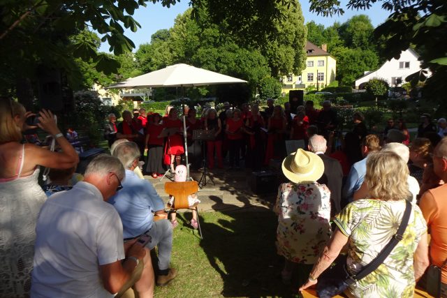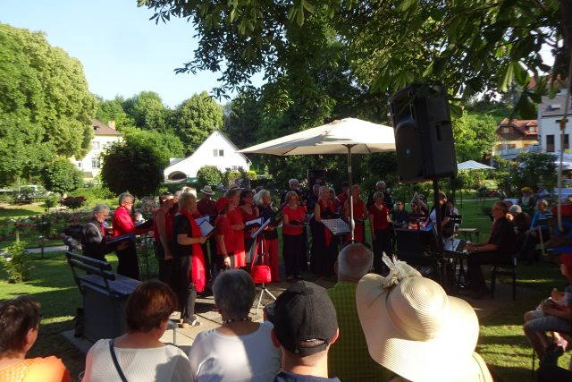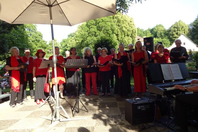 Dabei kam auch die Kulinarik und musikalische Auftritte nicht zu kurz. Der Haydnchor brachte am Sonntag als letzten Auftritt des Festes beschwingte Lieder aus Operetten und Musicals. Christiane Salvenmoser lockerte das Konzert durch stimmungsvolle Texte über Rosen auf. Ruth Spindler begleitete den Chor am Piano.